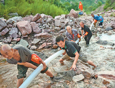 8月5日,河北省石家庄市井陉县测鱼村党员干部带领群众奋力抢修供水管网。