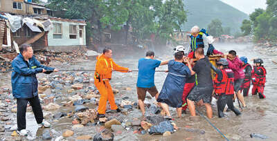 日前,北京市门头沟区南辛房村党员干部与消防员一起营救被困群众。