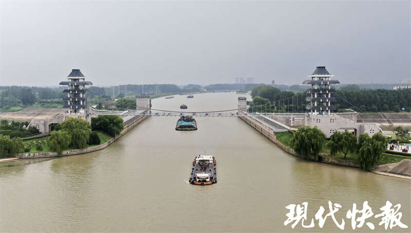上部的京杭大运河航槽,横跨在淮河入海水道之上,两条水道立体交叉,互不干扰。在这里,诞生了中国水利史上的奇迹——淮安水上立交枢纽工程,实现了淮河入海水道与京杭大运河的各自独立。