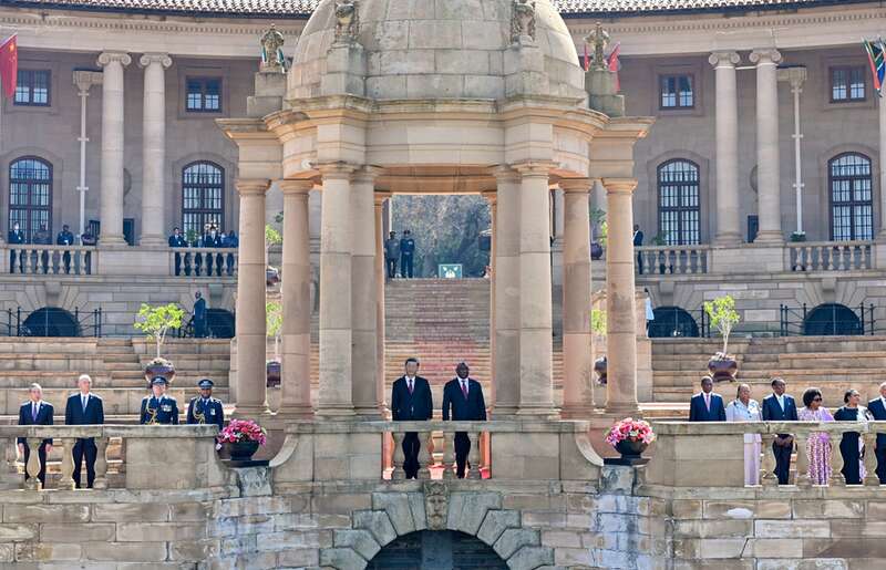 在总统摩托车队护卫下,习近平主席乘车抵达总统府,拉马福萨总统在下车处热情迎接。两国元首登上检阅台。仪仗队行持枪礼,军乐队奏中南两国国歌,现场鸣放21响礼炮。习近平主席检阅南非仪仗队。