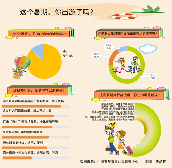 调查显示,这个暑假,87.0%的受访者都有出游计划,74.9%的受访者遇到过热门景区或场馆难预约的情况。