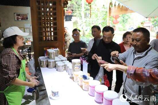 “您尝尝,胭脂果膏、牛肉干、野生菌……这些都是我们手工做的。”游客手握咖啡,走到村寨里的农特产品一条街,摊主们说着一口腾冲口音的普通话,摊主们热情地招揽来自五湖四海的客人。