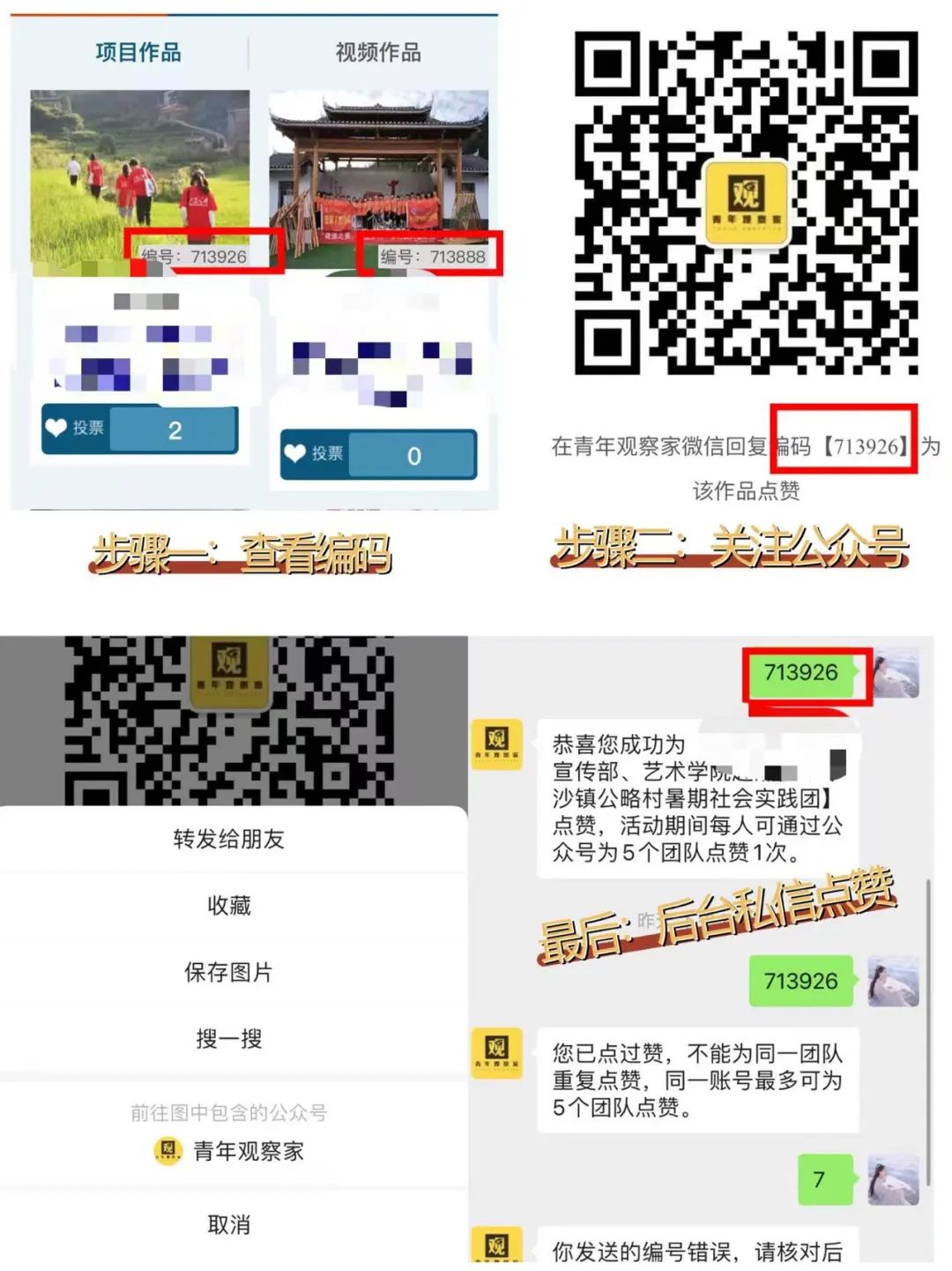 2、关注“青年观察家”微信公众号、在对话框私信回复相应编码进行点赞;