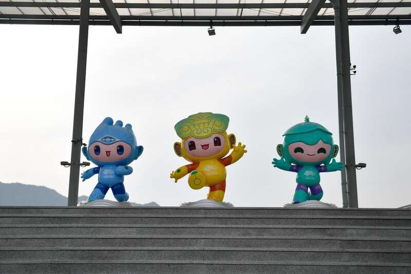 这是2022年3月29日在桐庐马术中心观众看台拍摄的杭州亚运会吉祥物宸宸、琮琮、莲莲(从左至右)。新华社记者黄宗治摄