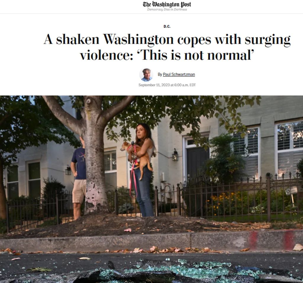 文章称,在过去的一年里,华盛顿特区的犯罪率急剧上升,其中不乏凶杀案、肆无忌惮的枪击案以及持枪少年劫持汽车的报道,这让这座本已在努力从新冠疫情恢复的城市惶惶不安。