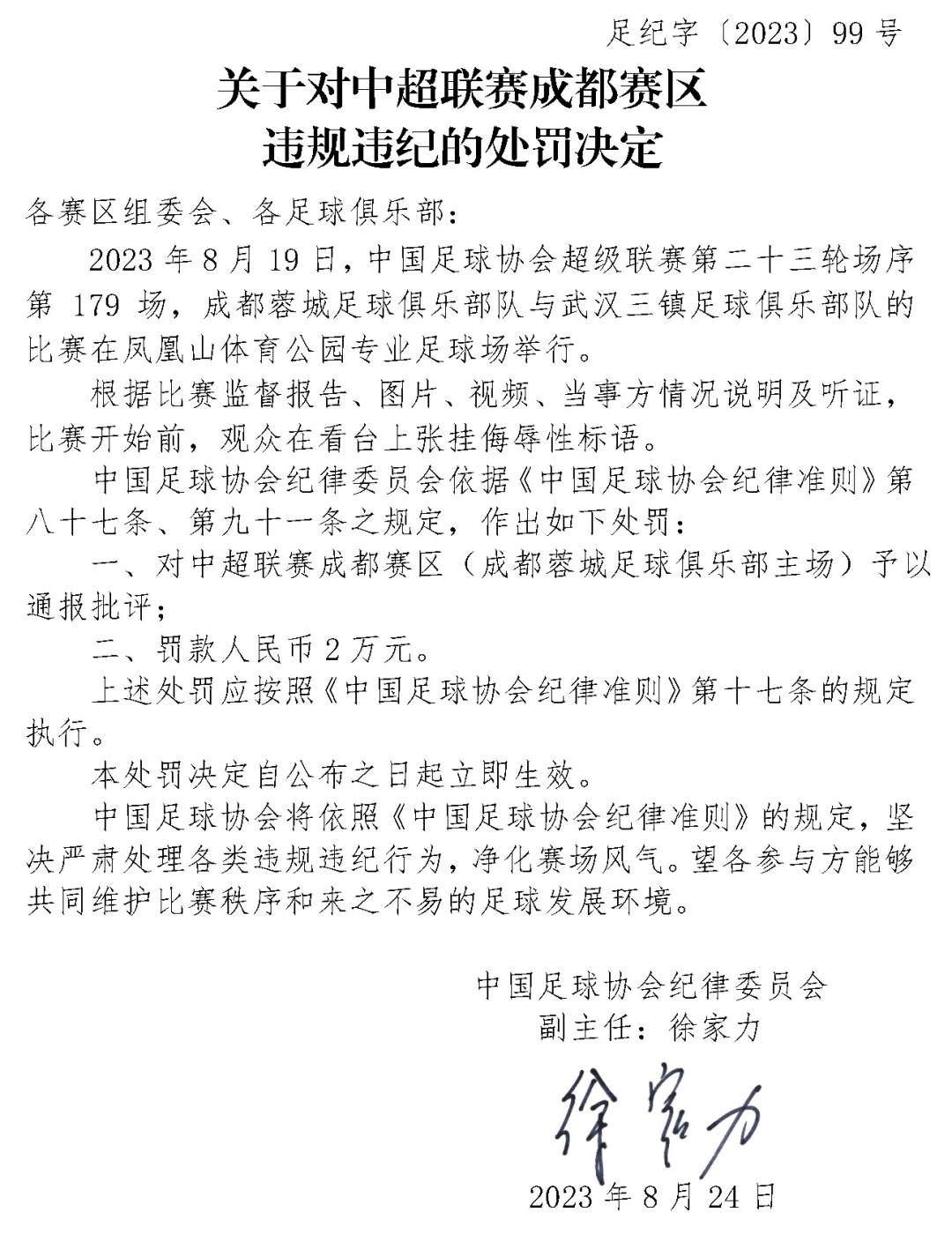 9月19日,中国足协发布两份处罚决定。因在8月19日中超比赛中,成都蓉城足球俱乐部球迷在看台张挂侮辱性标语,成都蓉城足球俱乐部和成都赛区被处罚。通告全文如下: