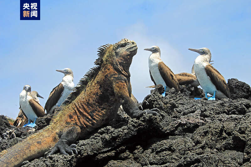 △加拉帕戈斯群岛上的海鬣蜥和蓝脚鲣鸟