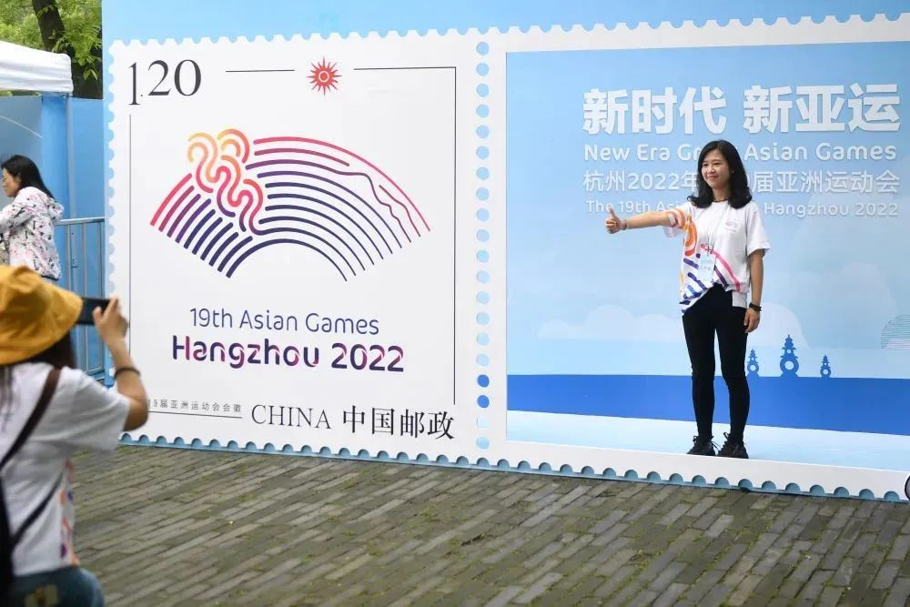 2019年5月18日,工作人员在杭州亚运会首套个性化专用邮票的模型边留影。新华社记者 黄宗治 摄