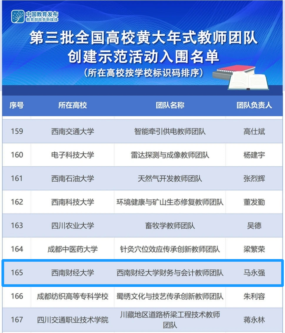 近日,教育部印发《关于公布第三批“全国高校黄大年式教师团队”创建示范活动入围名单的通知》,由西南财经大学会计学院马永强教授为负责人的“财务与会计教师团队”成功入选。