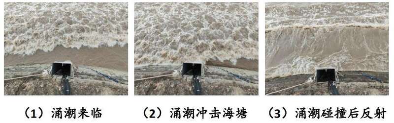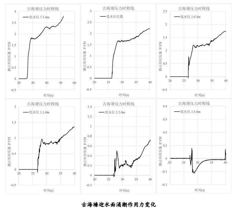 本次科考发现,古海塘涌潮作用力在潮前水位上、下部分的变化规律不同,低水位以上部分因受涌潮的瞬时冲击,在涌潮到达时刻,压力瞬间增加,而后再迅速回落,最后随水深加深而继续增加,值得注意的是,低水位以上还存在负压区;低水位以下部分,在涌潮到达时刻,压力瞬时增加,不存在瞬时回落的现象;涌潮作用下海塘压力于1分钟内急速上涨、震荡,涌潮前后的海塘压力最大增幅可达3倍涌潮高度。