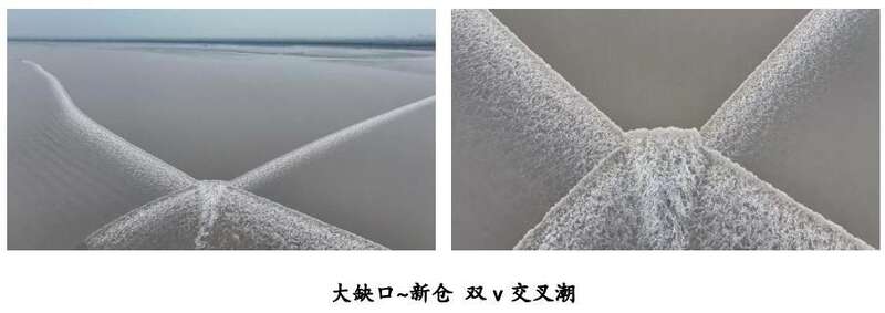 2023年科考发现交叉潮出现了新变化,从形态看,潮水在交叉后呈现出两个“V”字,而且处在动态的变化中。交叉之后,两股潮水继续行进,而中间的一股潮水呈现向前奔涌的态势,实属罕见。