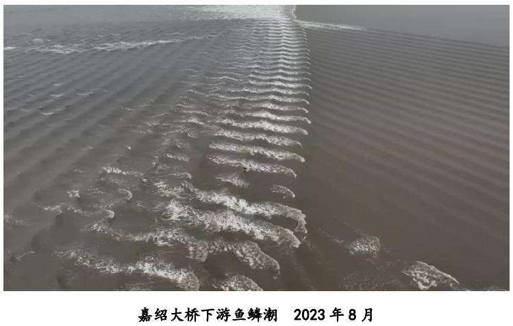 2023年涌潮科考期间,鱼鳞潮主要出现在上虞的虞北渔港上游到嘉绍大桥下游,受钱塘江滩槽变化影响,南岸潮前水深减小,北潮行进至南岸时无法充分演化为波纹潮,导致该区域鱼鳞潮出现的范围和规模较同期有所减少。