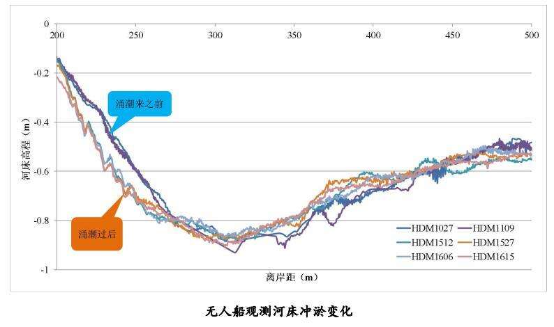 本次科考初步揭示了涌潮作用下的河床冲淤变化规律,涌潮对河床的塑造作用主要体现在刷滩淤槽,在滩地上,一个涌潮过程的河床冲刷幅度约为0.2~0.3米;在主槽内,河床有少量淤积现象,淤积幅度约在0.1米左右。
