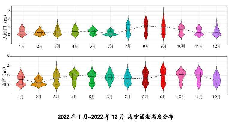 2021年至今,统计表明,临江码头、大缺口、盐官涌潮观赏星级3星以上的占比平均为69.6%、35.8%、51.7%,一年内3星以上的涌潮观赏期达到254、131、189天。2022 年,海宁大缺口、盐官涌潮高度月最大值出现在9月,年内7~11月的涌潮较为壮观。