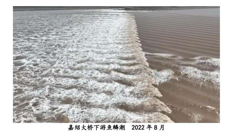 鱼鳞潮是2021年涌潮科考期间首次在上虞发现,2022年除了上虞,还在海宁新仓、杭州下沙、五丰岛等多处新发现了鱼鳞潮,两年间,嘉绍大桥下游约5千米范围一直是最为壮观的区域。鱼鳞潮的形成机制较为复杂,总的来说,它是两股潮相遇交汇形成的特殊潮景,其中至少应有一股波纹潮,波纹潮潮头波峰、波谷特征是形成鱼鳞潮的必要条件之一。