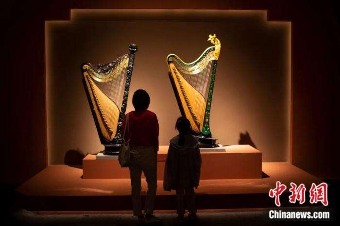 在中国国家博物馆展出的《天地同和——中国古代乐器展》上,参观者欣赏转调箜篌展品。田雨昊 摄