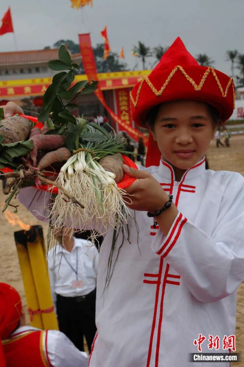 海口小姑娘用春葱、地瓜和桑桔等农家土特产品祭祀“岭南圣母”冼夫人。王辛莉 摄