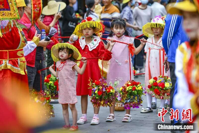 2023年2月28日,第二十二届海口冼夫人文化节(原称军坡节)之“装军巡游”活动在海南海口新坡镇举行。图为在活动中肩挑花篮的小女孩。骆云飞 摄