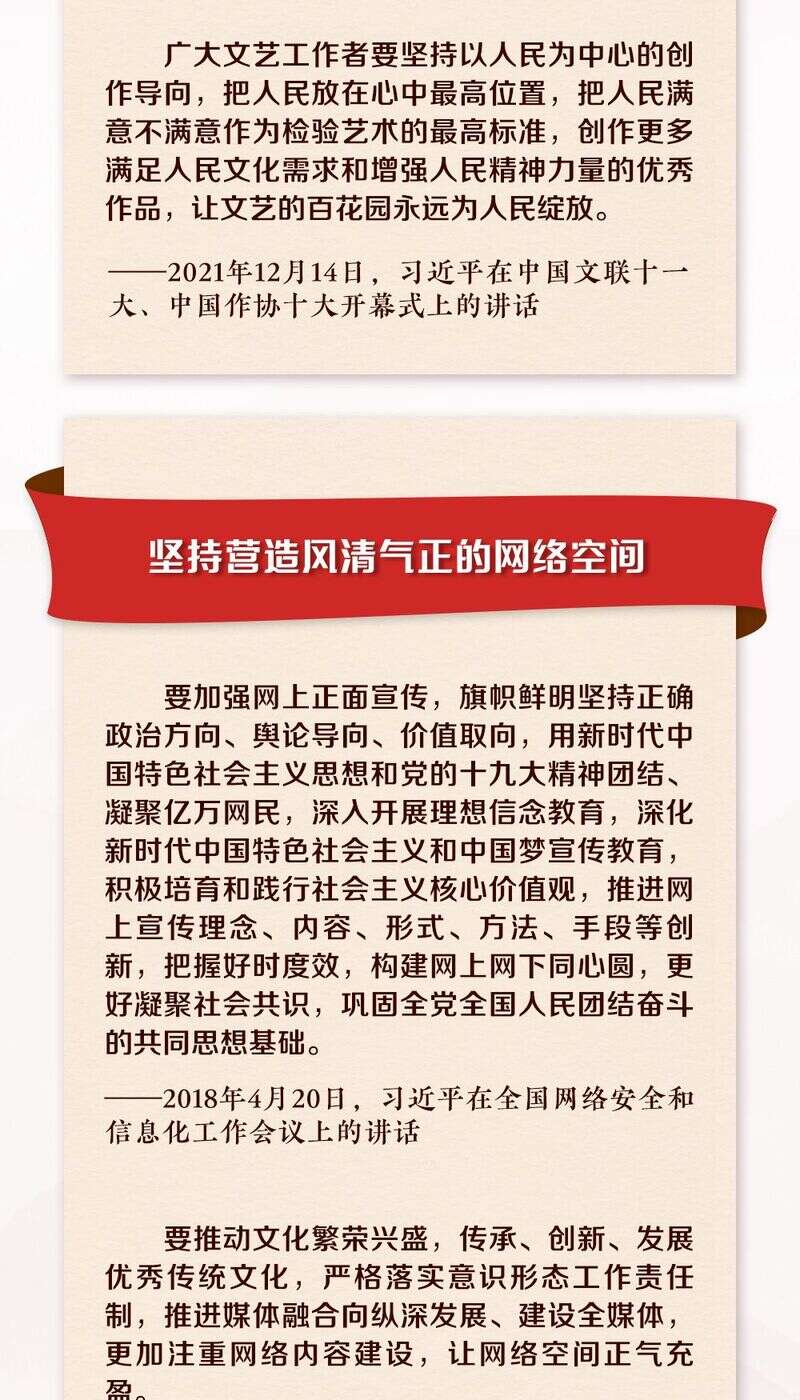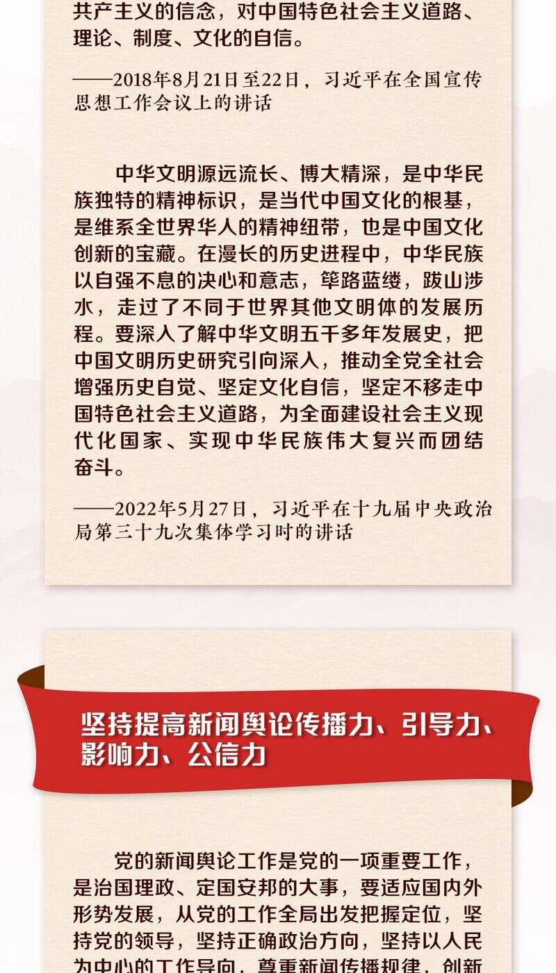 五年前,习近平总书记在全国宣传思想工作会议上提出了宣传思想工作的“九个坚持”,即“坚持党对意识形态工作的领导权”“坚持思想工作‘两个巩固’的根本任务”“坚持用新时代中国特色社会主义思想武装全党、教育人民”“坚持培育和践行社会主义核心价值观”“坚持文化自信是更基础、更广泛、更深厚的自信,是更基本、更深沉、更持久的力量”“坚持提高新闻舆论传播力、引导力、影响力、公信力”“坚持以人民为中心的创作导向”“坚持营造风清气正的网络空间”“坚持讲好中国故事、传播好中国声音”。