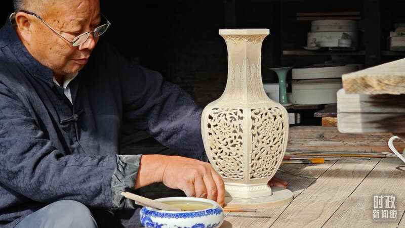 △非遗传承人正在制作镂空瓷瓶。(总台央视记者彭汉明拍摄)