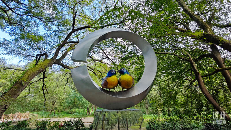 △石门村里的蓝冠噪鹛雕像。(总台央视记者许永松拍摄)