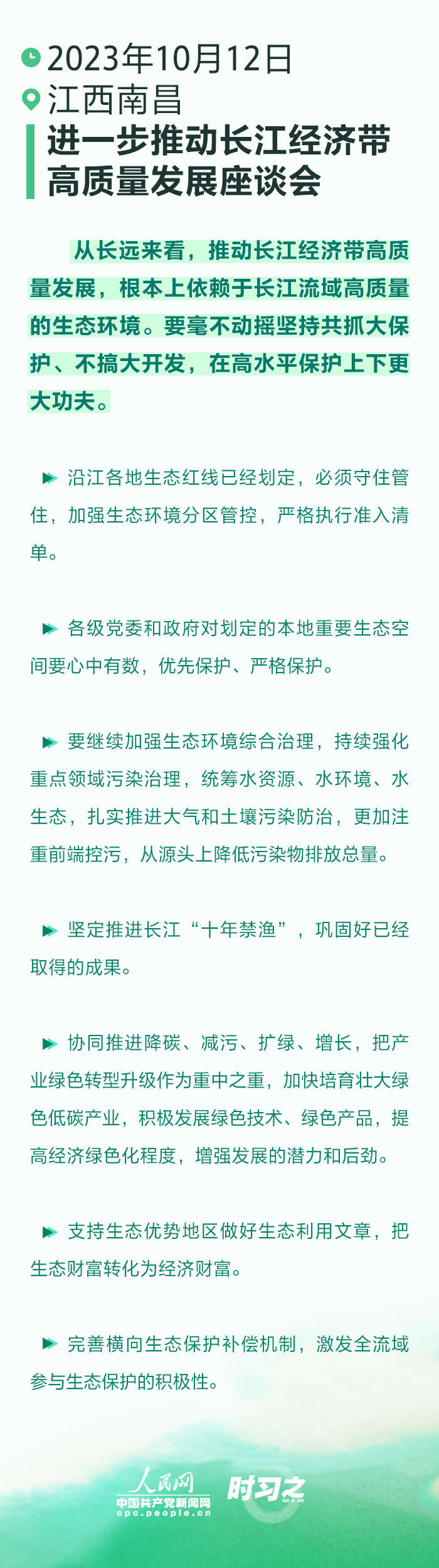 10月12日下午,习近平总书记在江西省南昌市主持召开进一步推动长江经济带高质量发展座谈会并发表重要讲话。座谈会上,总书记指出,从长远来看,推动长江经济带高质量发展,根本上依赖于长江流域高质量的生态环境。