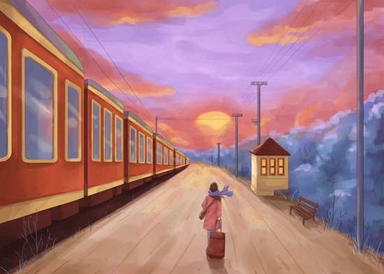 发车前不久,我独自拥着背包、拖着箱子,穿梭在熙熙攘攘的候车室里,字正腔圆的广播、嗡然不绝的交谈、轱轱辘辘的行李箱滑行……四面八方奔涌而至的过客犹如水滴融入大海。喧闹是属于外界的,我只觉得像闯入了平行世界,周围环绕着没有触感的一切,而沉甸甸的行李很快又将我拉回现实。而后,回家待的时间越来越短,行李越来越轻,我也逐渐习得了旅途的参与感。