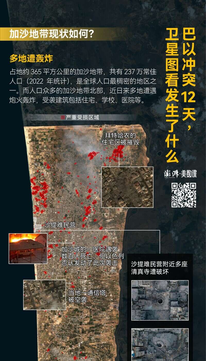 澎湃新闻通过梳理卫星遥感数据、历次冲突伤亡数据以及媒体公开报道,试图还原这 12 天里陷入战火的加沙地带发生的事情。