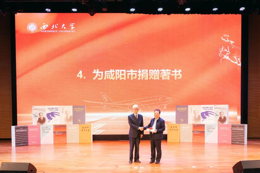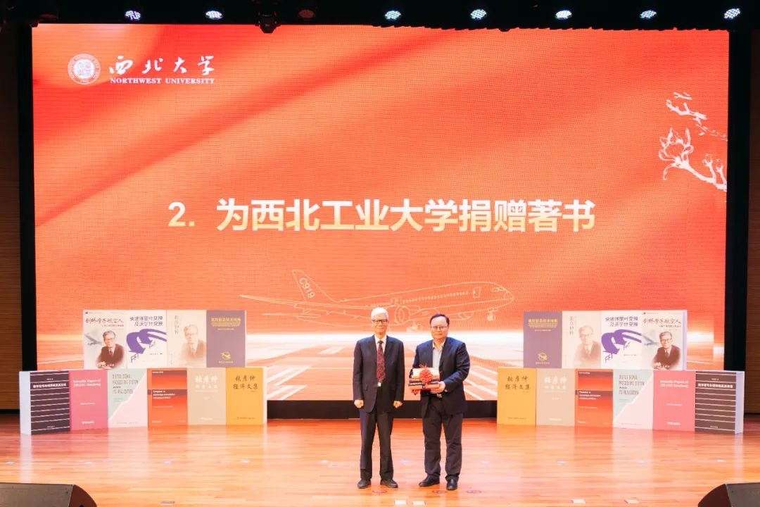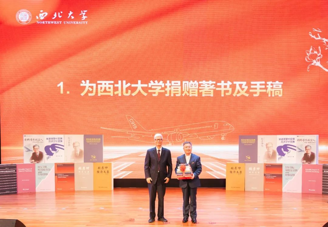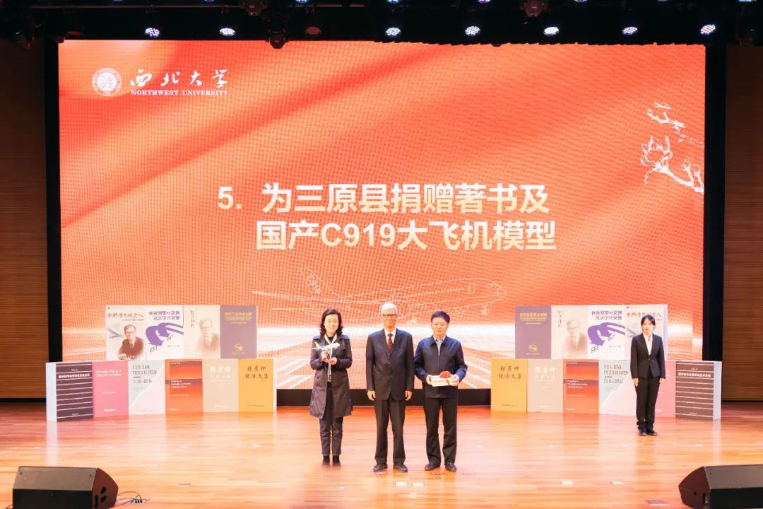 张彦仲院士分别向西安交通大学、西北工业大学、咸阳市、三原县和西北大学捐赠了《数字信号处理系统及其实现》等十一种图书共计二百余册,并向西北大学捐赠了论文手稿和C919大飞机模型。