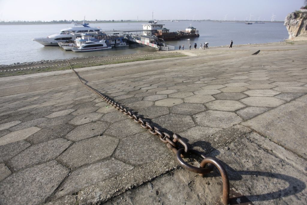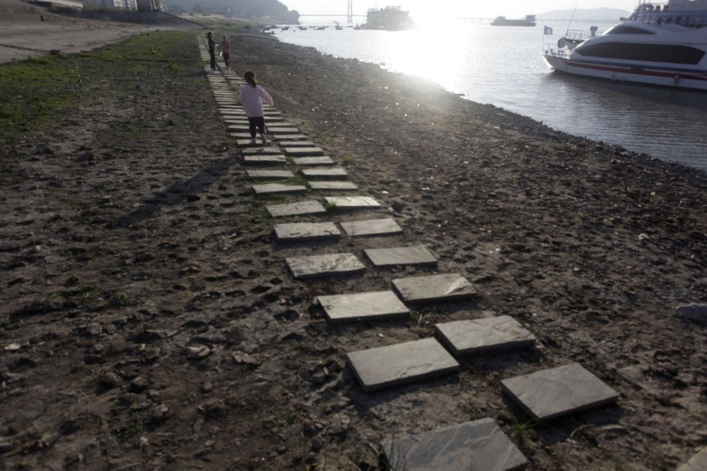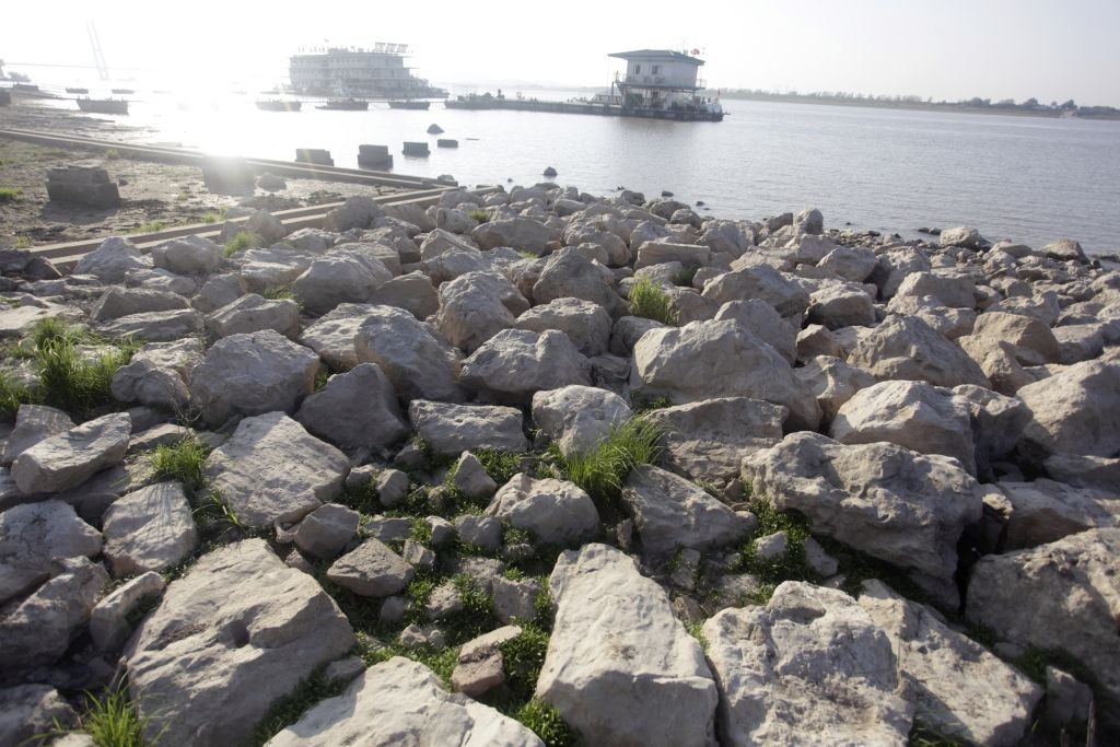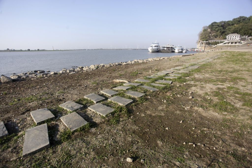 2023年11月2日,江西九江,进入枯水期的鄱阳湖石钟山水域的湖滩,护坡石已经裸露出来。