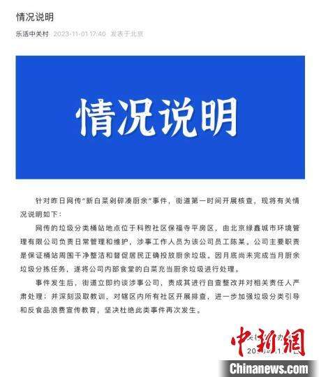 11月1日,北京海淀区中关村街道办事处发布情况说明:网传的垃圾分类桶站地点位于科煦社区保福寺平房区,由北京绿鑫城市环境管理有限公司负责日常管理和维护,涉事工作人员为该公司员工陈某。公司主要职责是保证桶站周围干净整洁和督促居民正确投放厨余垃圾。因月底尚未完成当月厨余垃圾分拣任务,遂将公司内部食堂的白菜充当厨余垃圾进行处理。