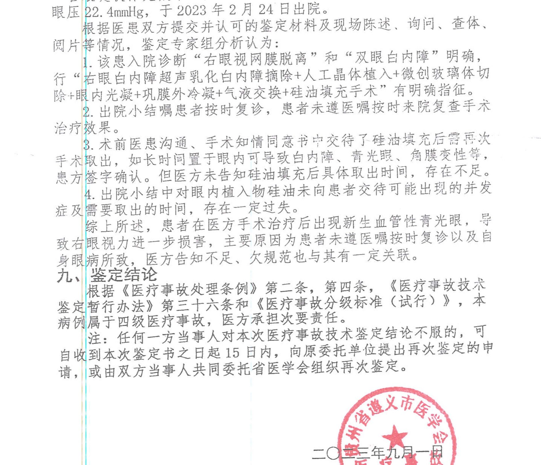 9月1日,遵义市医学会就此事出具了医疗事故技术鉴定书,其中指出:“术前医患沟通、手术知情同意书中交代了硅油填充后需再次手术取出,如长时间置于眼内可导致白内障、青光眼、角膜变性等,患方签字确认。但医方未告知硅油填充后具体取出时间,存在不足;出院小结中对眼内植入物硅油未向患者交代可能出现的并发症及需要取出的时间,存在一定过失;出院小结嘱患者按时复诊,患者未遵医嘱按时来院复查手术治疗效果。