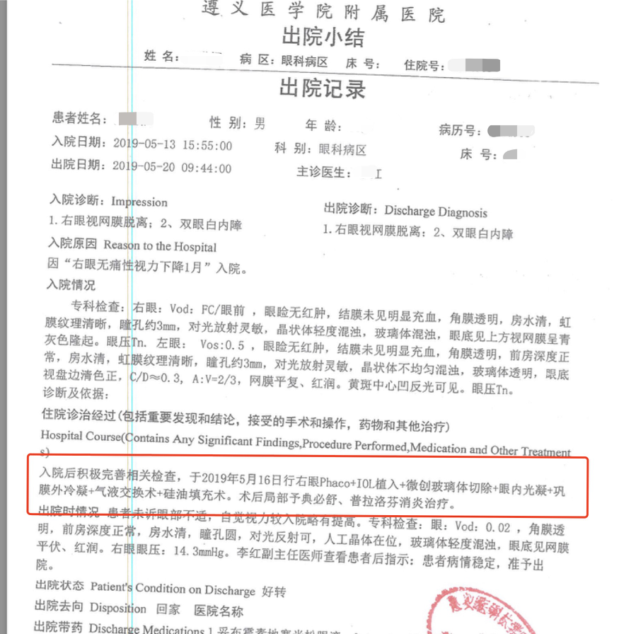 据王先生介绍,2019年5月,他的父亲因右眼视力下降前往遵义医学院附属医院眼科就诊。经检查确诊为右眼视网膜脱离和双眼白内障,于当天住院等待治疗。5月16日,医生给王先生父亲实施了“右眼白内障超声乳化白内障摘除+人工晶体植入+微创玻璃体切除+眼光内凝+巩膜外冷凝+气液交换+硅油填充手术”,患者于5月20日拿药出院。