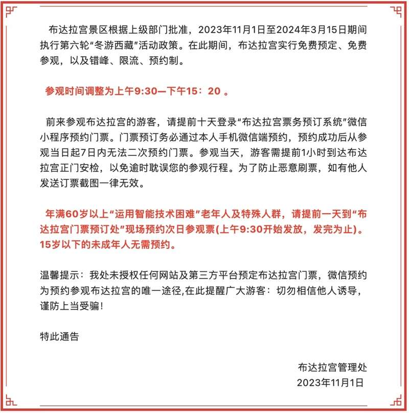 据“西藏发布”消息,11月1日,布达拉宫管理处发布《关于第六轮“冬游西藏”通告》。《通告》表示,布达拉宫景区根据上级部门批准,2023年11月1日至2024年3月15日期间执行第六轮“冬游西藏”活动政策。在此期间,布达拉宫实行免费预定、免费参观,以及错峰、限流、预约制。参观时间调整为上午9:30—下午15:20。