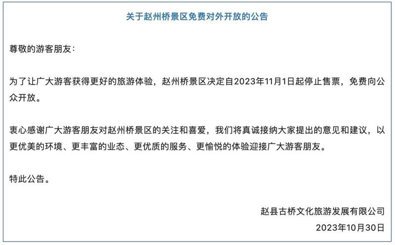 石家庄赵县赵州桥景区决定自2023年11月1日起停止售票,免费向公众开放。
