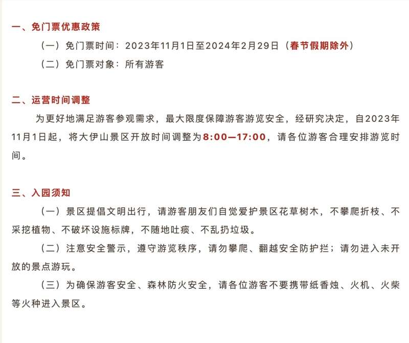 江苏省连云港市大伊山景区宣布,2023年11月1日至2024年2月29日(春节假期除外)对所有游客免门票。