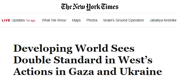 美国《纽约时报》日前刊文称,多国认为美西方在巴以冲突和俄乌冲突中的行动存在“明显双标”。文中写道,美国总统拜登日前在白宫办公室中发表讲话,将美国对乌克兰和以色列的支持联系在一起,都在与决心“彻底消灭”他们所谓的敌人作战。文中写道,以色列对加沙地区的反击、威胁发动地面攻击以及美国不顾一切地“紧拥”对其最重要的中东盟友,都引发了对其虚伪的指责。