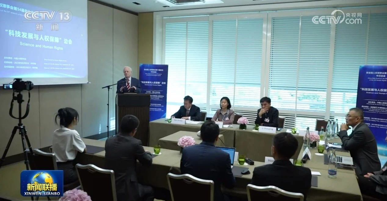 2023年10月12日,央视《新闻联播》报道了中国社会组织在联合国人权理事会第54届会议期间举办多场主题边会,由北京理工大学科技人权中心七位专家组成的中国人权研究会代表团进行了大会现场发言,声音响彻会场。