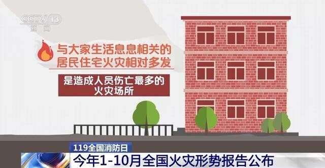 报告还显示,与大家生活息息相关的居民住宅火灾相对多发,是造成人员伤亡最多的火灾场所。今年1—10月,各类住宅共发生火灾24.4万起,造成979人死亡、1244人受伤,分别占总数的32.8%、70.9%和60.3%。