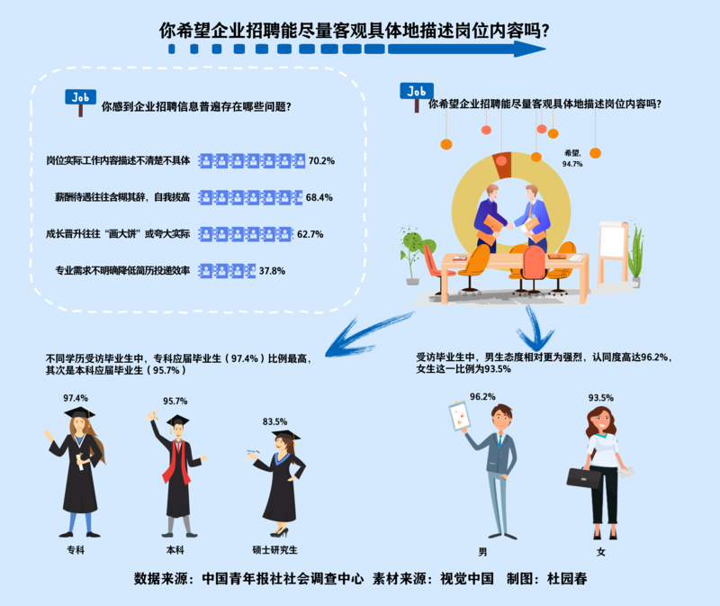 调查中,94.7%的受访应届生希望企业招聘过程能尽量客观具体地描述岗位内容。