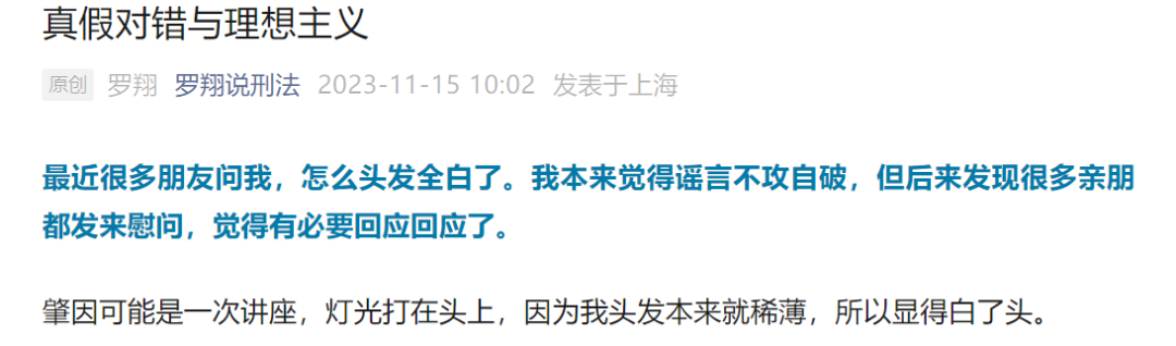 11月14日,罗翔发布了题为《看我被“白头”,很多亲友发来慰问,还有对错真假吗?》的视频,辟谣自己“头发全白,容貌苍老”的相关传言。