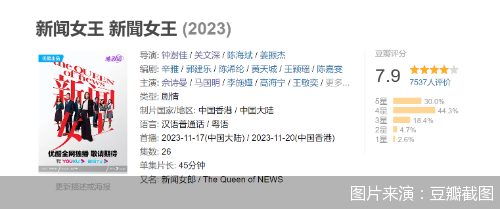 公开资料显示,《新闻女王》由钟澍佳、关文深监制,佘诗曼、马国明、李施嬅、高海宁领衔主演。日前,首轮口碑评分出炉,豆瓣开分7.9分。据北京商报记者不完全统计,该分数为年内上线港剧的豆瓣评分最高分。