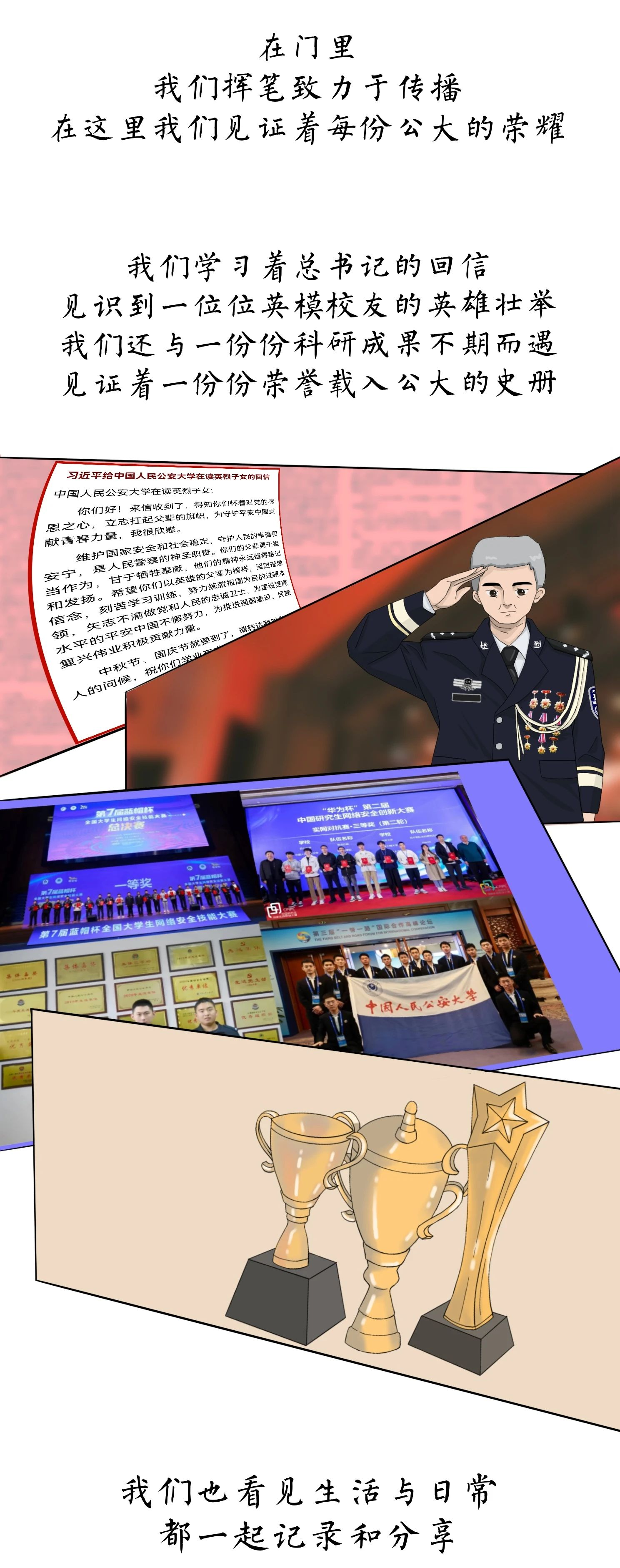 公安大学对于大众来说,是神秘的,而正是因为我们作为连接者和桥梁,将公大的生活刻录,将公大的特别传递,于琐碎平常之下窥见新颖乐趣,是我们的使命。