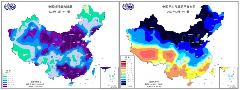 全国经历了前期持续偏暖、后期急剧降温的“过山车”式气温起伏。12月1-13日全国平均气温较常年同期偏高,为历史同期最高,云南、宁夏气温均为历史同期最高。但从14日开始,受大范围寒潮天气影响,全国大部地区气温骤降,部分国家气象站日最大降温幅度突破历史极值。