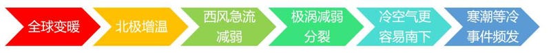 赤道与极地之间存在巨大温差,这种差异促使极圈外围形成了一圈强劲的西风,环绕在极地周围,它被称之为西风急流。西风急流就像“围栏”一样,约束着极地的冷空气。如上图所示,稳定的极涡被强大的西风急流限制在北极地区,在全球变暖背景下,北极地区增温速度是全球的2-3倍。北极地区增温,与中低纬度气温差减弱,难以维持强大的西风急流,极涡内的冷空气变得“躁动不安”,更容易分裂南下。北极来的冷空气,其温度远远低于我们生活的中低纬度地区,由此便形成如下图般的故事线,多次出现的寒潮天气让我们感到“冷冷冷”。
