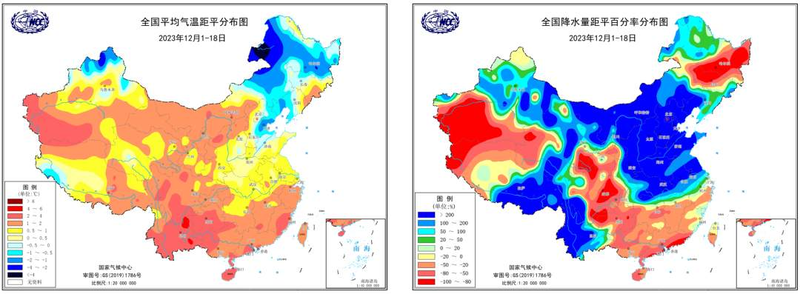 今年12月上旬偏暖显著,月中降温幅度大。12月以来(截至18日)北方大部地区降水显著偏多。这期间,全国平均气温-1.3℃,较常年同期偏高0.9℃,全国大部地区气温以偏高为主。