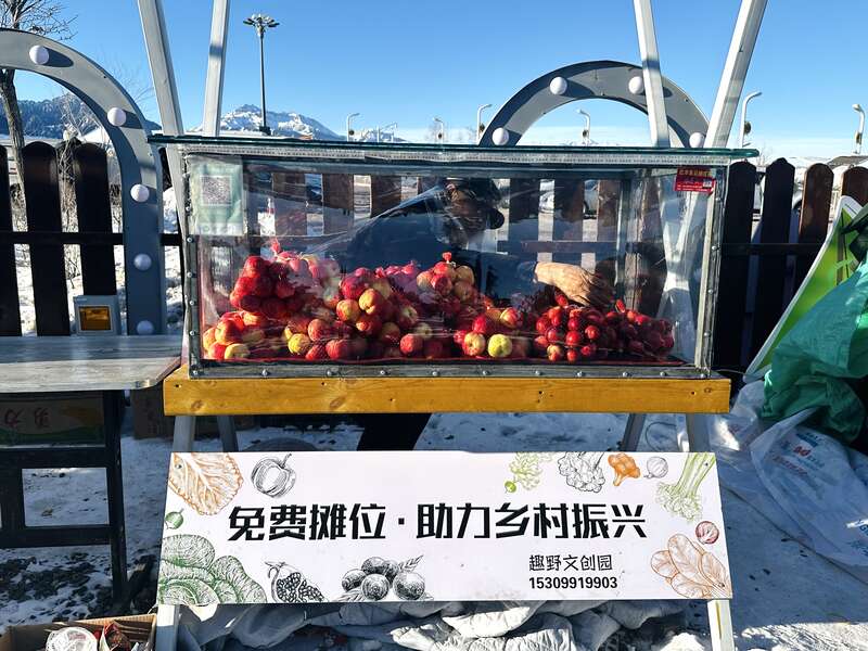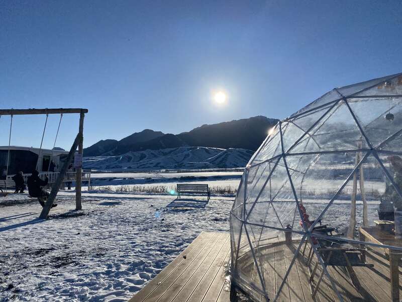 12月19日,中青报·中青网记者跟随“追着雪花看新疆”主题采访活动来到位于乌鲁木齐县水西沟镇闸滩村的野路子营地·趣野文创园。这座占地面积近40亩的营地,是今年8月当地新增的一处集露营地、特色集装箱、网红奶茶、太空舱住宿和集市花车等于一体的文创园,位于丝绸之路正北面,能近观丝绸之路、也能眺望南山美景。