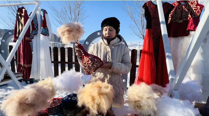 乌鲁木齐县野路子营地·趣野文创园花车集市在售的哈萨克女帽。中青报·中青网记者焦敏龙/摄