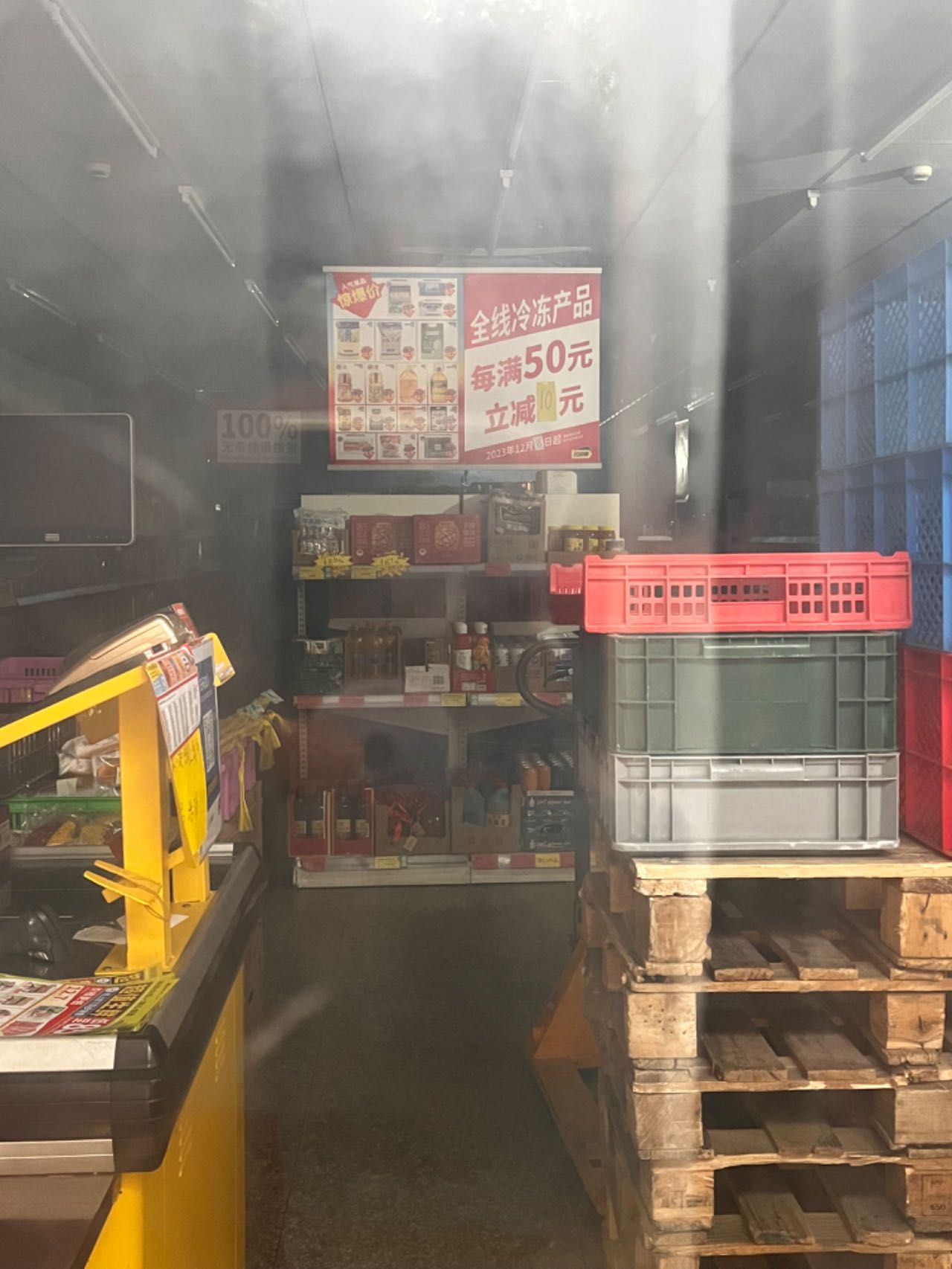 记者现场看到,三家比宜德超市的门上都未张贴关停的告示,但大门紧锁。透过窗户往里看,室内货柜收纳整齐,有不少货品。窗玻璃上贴着大幅的超市促销海报,如“2023年12月18日起,全线冷冻产品每满50元立减10元”“2023年11月10日起,零食部分产品7折起”“散称洋鸡蛋天天低价”等,此外还有不少“天天低价”“惊爆价”的商品介绍。不少爷叔阿姨路过此处,都会停下来朝窗里“猫”一眼,“猫”的人多了,就一起讨论两句。