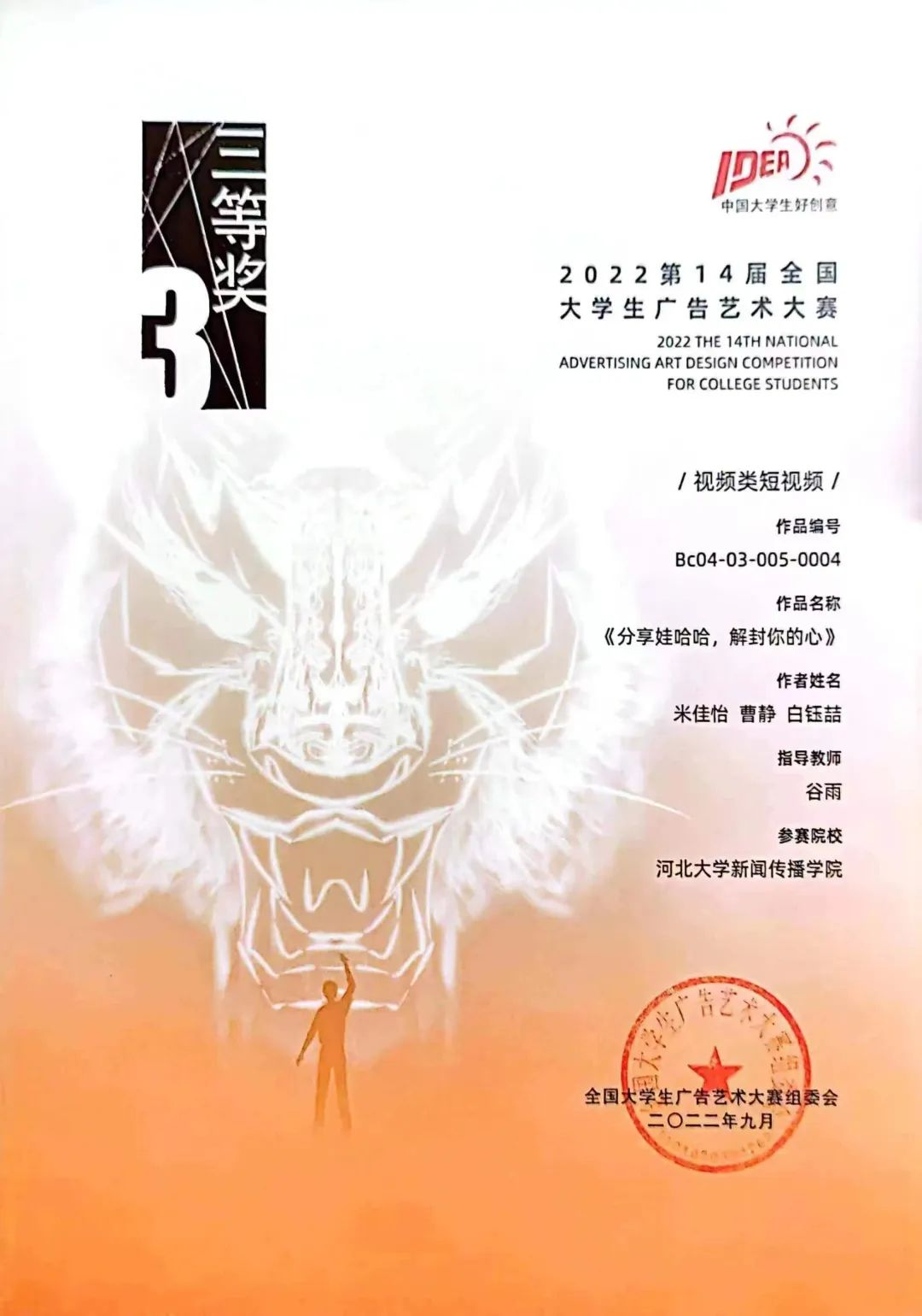 白钰喆,河北大学新闻传播学院2020级新闻学专业学生,成功保研至北京师范大学新闻与传播专业。在校期间,荣获全国大学生广告艺术大赛国家三等奖,全国大学生英语竞赛C类二等奖,“外研社·国才杯”全国英语阅读比赛省级二等奖,“外研社·国才杯”全国英语阅读比赛河北大学赛区一等奖,大学生挑战杯学术科技竞赛校级二等奖,“互联网+”大学生创新创业大赛校级优秀奖等。连续两次取得河北大学优秀学生奖学金一等奖,多次获得校级三好学生、优秀共青团成员称号。